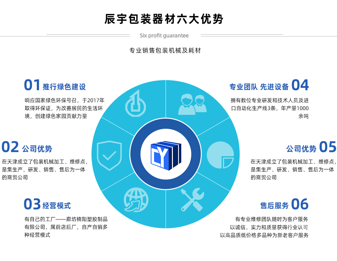 天津辰宇包裝器材有限公司原天津市辰宇商貿(mào)有限公司,位于天津市南開區(qū)密云一支路新南馬路五金城二區(qū)33棟106號(hào),本公司主要經(jīng)營(yíng):打包帶,打包機(jī)系列,封箱機(jī)系列,纏繞機(jī)系列,拉伸膜,膠帶,尼龍繩,其他包裝耗材等產(chǎn)品 公司產(chǎn)品質(zhì)優(yōu)價(jià)廉,暢銷全國(guó)各大城市。同等質(zhì)量比價(jià)格,同等價(jià)格比質(zhì)量,我們確保質(zhì)量,價(jià)錢合理,交貨迅速及時(shí)。公司始終秉承“精益求精,鑄造品質(zhì)的典范”的經(jīng)營(yíng)理念,真誠(chéng)為廣大客戶提供真誠(chéng)的服務(wù)! 天津市辰宇包裝器材有限公司,感謝廣大新老客戶的鼎力支持,竭誠(chéng)歡迎社會(huì)各界朋友前來洽談業(yè)務(wù),愿真誠(chéng)合作攜手共創(chuàng)美好未來!